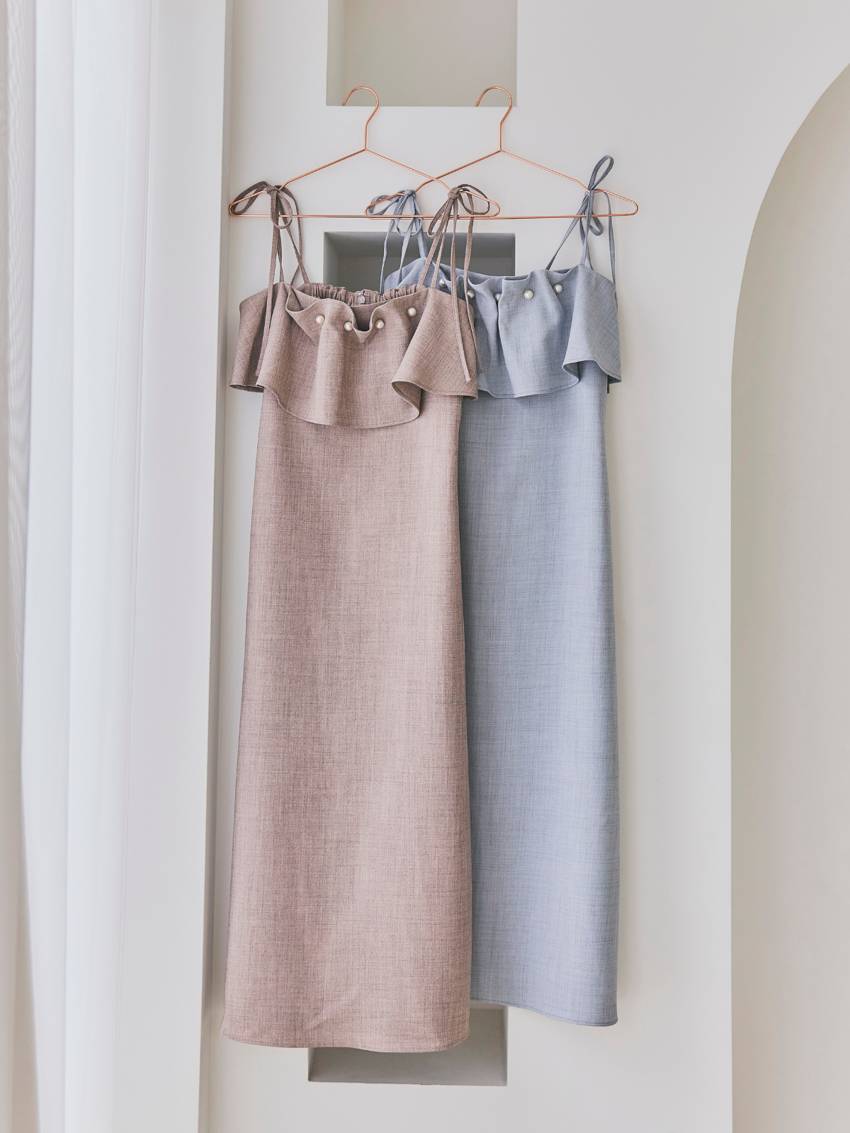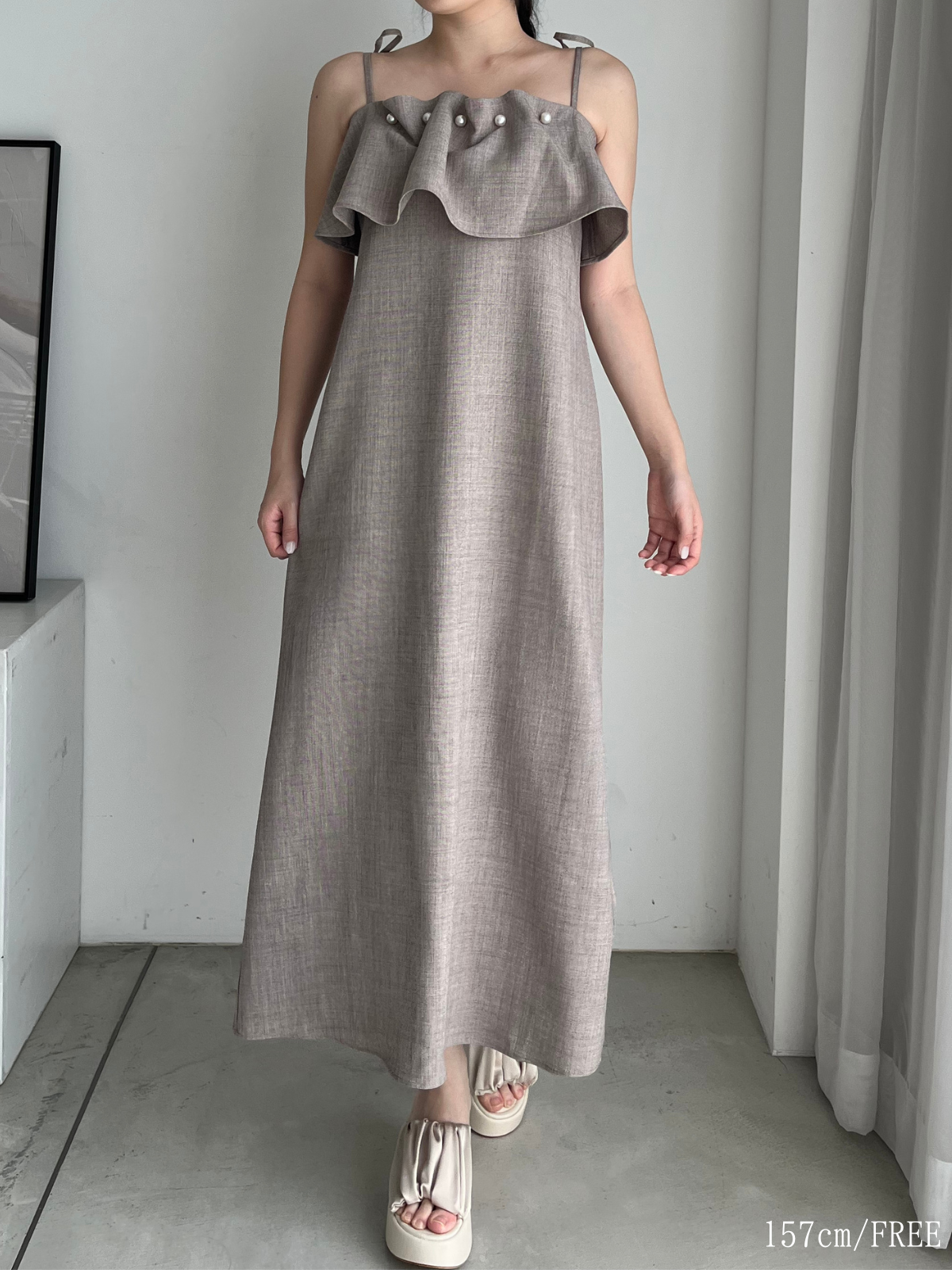 胸元にあしらわれた大きなパールとフリルが存在感を放つ、華やかなキャミワンピースです。