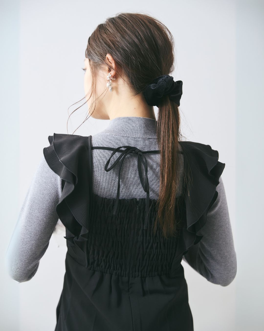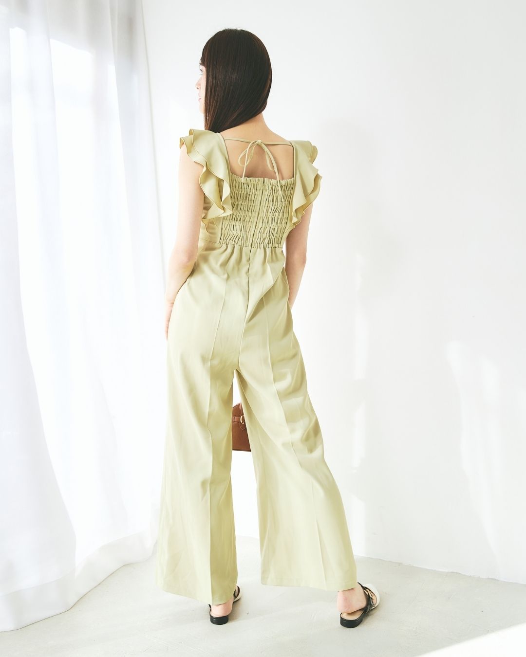 フロントのたっぷりフリルが華やかなオールインワンです。高めのウエスト切り替えと、