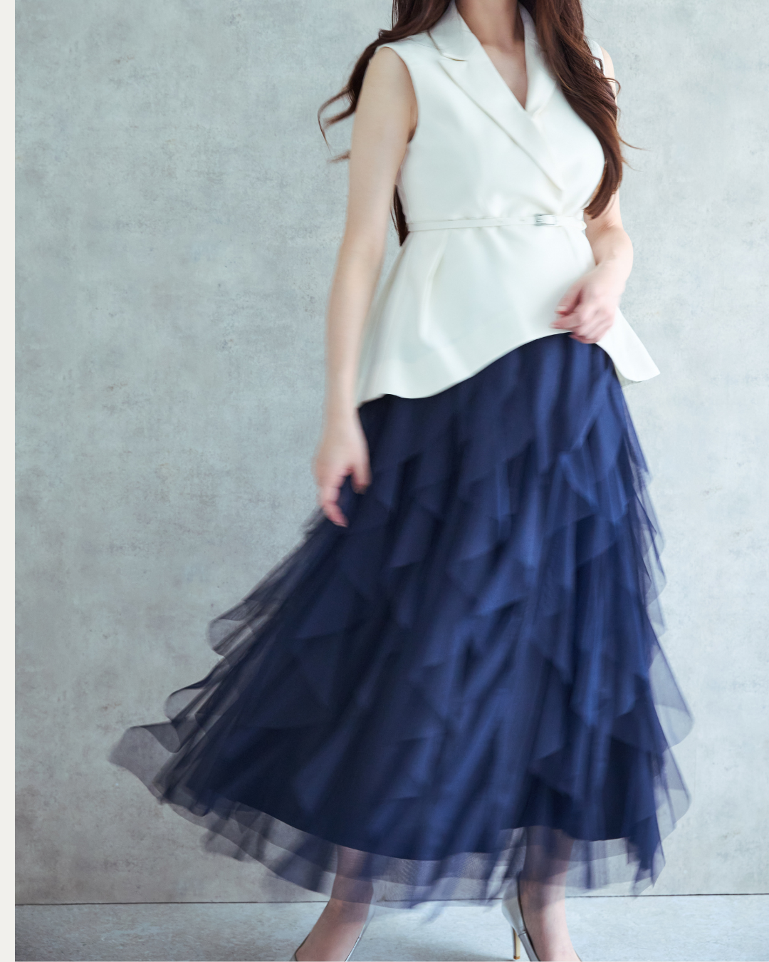 幾重にも重ねられたチュールがふんわりとしたボリュームを生み出しつつ、縦のラインを強調することでスタイルアップも叶えます。
