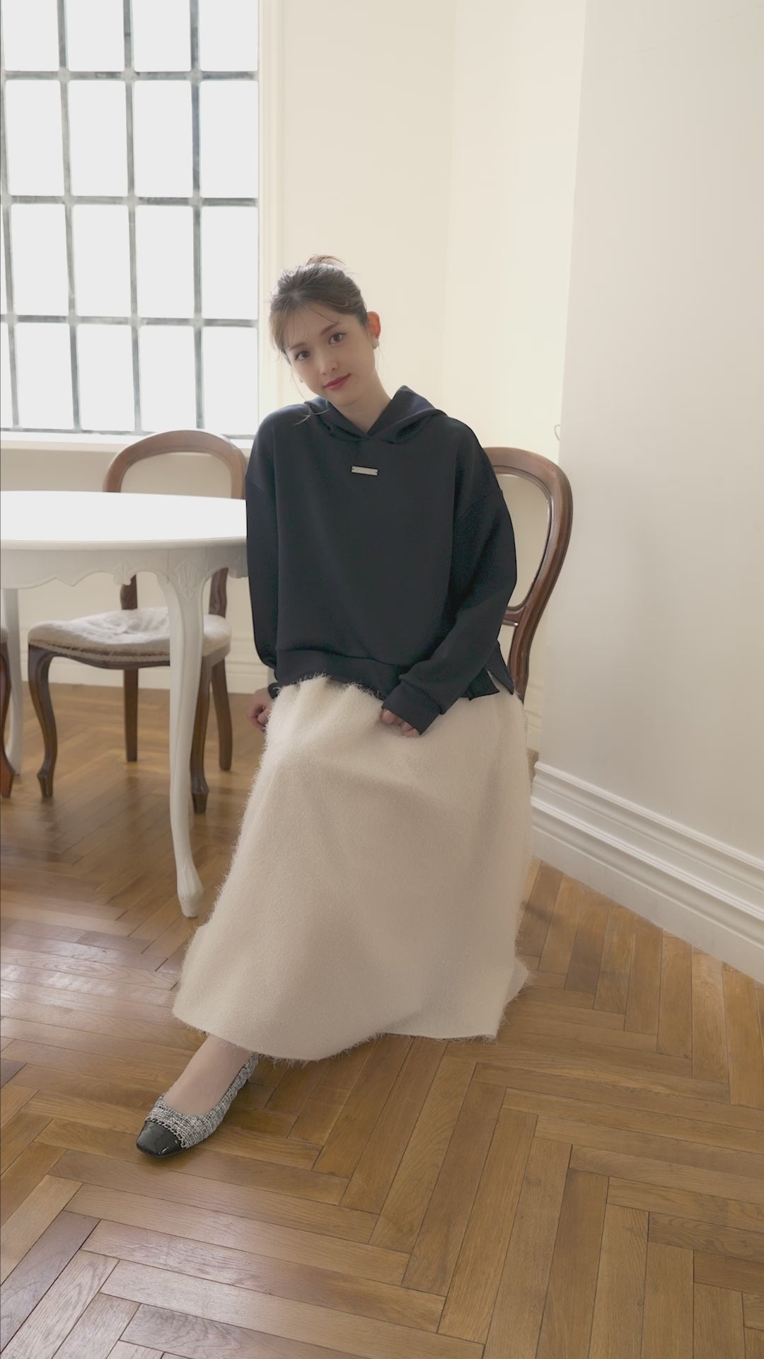 Mサイズ:短め丈。スリット入りで抜け感があるので、ボリュームボトムとも好相性。